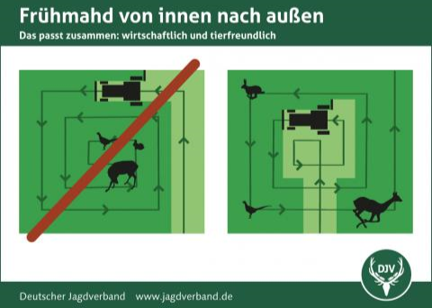 Die Frühmahd von Grünland steht an. Um Wildtiere vor dem Kreiselmäher zu retten, sollte von innen nach außen gemäht werden. Durch verschiedene Maßnahmen können Wildtiere vor dem Mähtod gerettet werden. Wichtige Informationen finden Sie hier.