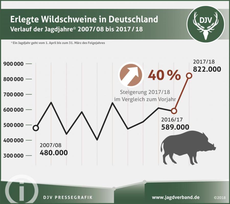 Vorläufiges Ergebnis: Über 820.000 Wildschweine haben Deutschlands Jäger in der Saison 2017/18 erlegt. Das ist der höchste Wert seit Beginn der Aufzeichnungen. Etwa 16,4 Millionen Stunden Einsatz waren notwendig. Die mögliche Einschleppung des ASP-Virus lässt sich am besten durch mehr Biosicherheit an Verkehrswegen verhindern. Lesen Sie hier weiter auf den Seiten des DJV.